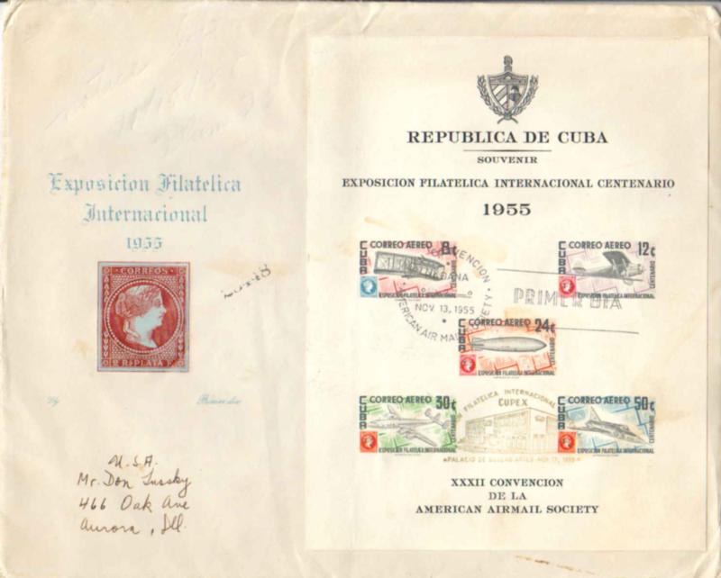 1955 Scott C126a 8c Wright Brothers Plane, 12c Spririt of St. Louis, 24c Graf Zeppelin, 30c Constellation and 50c Convair Jet Imperforate Philatelic Exposition Souvenir Sheet 1955 Habana Convention American Air Mail Society Primer Dia. First Day to Aurora, Ill. Cacheted. ( Inv #: CUBC126aL01) (Image)