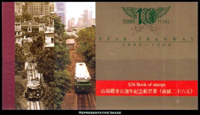 1988 Scott 527-529 50c, $1.30, $1.70 and $5 Various Views of Hong Kong and the Tram Line Complete Booklet of three Se-tenant Booklet Panes. Mint never hinged. ( Inv #: HKG0527C1) (Image)
