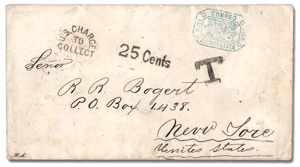 1878 Stampless cover from Antofagasta to New York, a handsome cover with a neat strike of an ornate blue "Correo/Antofagasta/10c" octagonal handstamp; 10c paid the postage to Lima, Peru, receiving that city's transit on the reverse, a rare "Transatlantico" French maritime c.d.s., Oct 31, applied for transatlantic passage to England with London backstamp, then to the United States with "U.S. Charge/to/Collect" and "25 Cents" handstamps, Very Fine. A most interesting routing, illustrating the difficulty of getting mail out of Bolivia to various parts of the world; a very rare and handsome cover., Ex-Ortiz-Patino.
