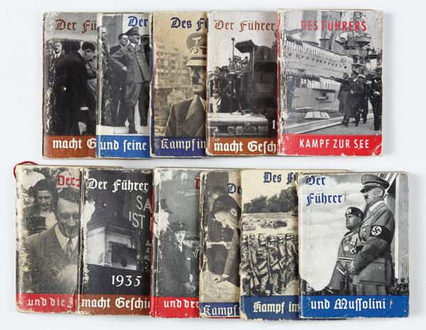 Winterhilfswerk Hitler Fundraising Miniature Books, 1933-35, features 11 "books" in total; sold by the Winterhilfswerk to raise funds for soldiers and to feed the public; books vary in condition, with some wear, but are generally good; an attractive lot, especially with so many different variants. Shipping charges apply - weight 1 lbs. (Image)