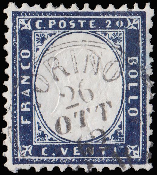 1862, Victor Emmanuel II, 20c deep dark blue (Scott 19e), uncommonly fresh and well centered with a neat "Torino, 26 Ott, 69" c.d.s. cancel, Very Fine to Extremely Fine. Sassone 2f; €9,000 ($9,720). Scott $4,500.