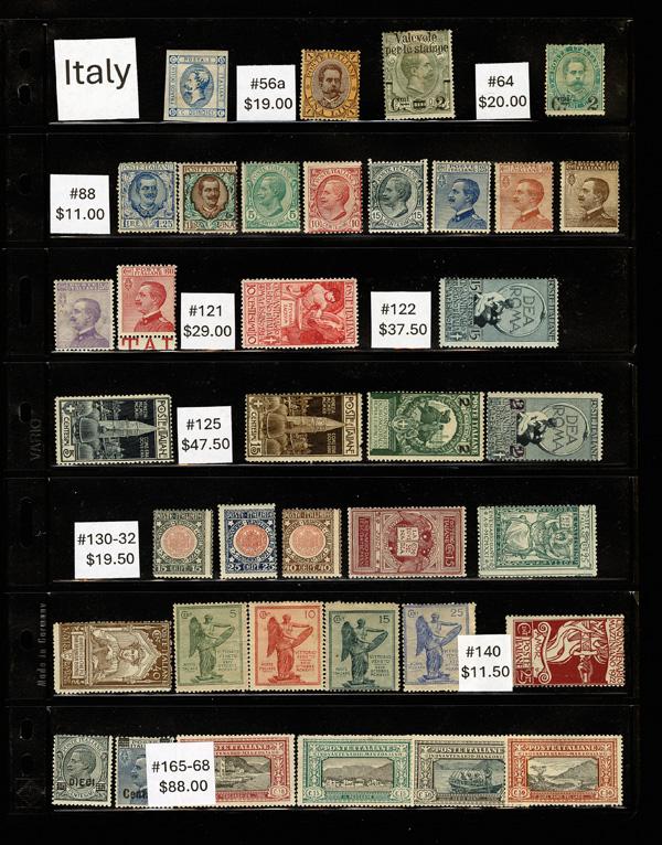 Italy, Beautiful works of art 1863-2015, Nearly 900 unused different on Vario stock pages; from #23//3554, B1//B46, C3//C140, CE3, D15//D22, E6//E20, EY2//EY13, J41//J68, M1//M12, MC1//MC4, MEC1, ME1, O2//O6, Q24//Q78, QY16, 1N1//1N13, 1LN1//1LN19, 1NC1, I.S.R. 1//34, E1//E3, and EY1; also includes a few Vatican stamps ranging from #110//1356, EY9//EY10; catalog $1,400, Fine to Very Fine. Shipping charges apply - weight 3.2 lbs. (PDF for this Lot) (Image)