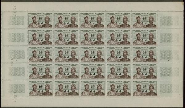 1962, 6d on 25F Reunification (Scott 356), full pane of 25, a lovely pane with full marginal markings, sharp color and crisp overprint, o.g., never hinged; gum lightly but evenly toned, still Very Fine, stamps catalogue $175 each, with no premium for dated corner block or other markings. Scott $4,375. (Image)