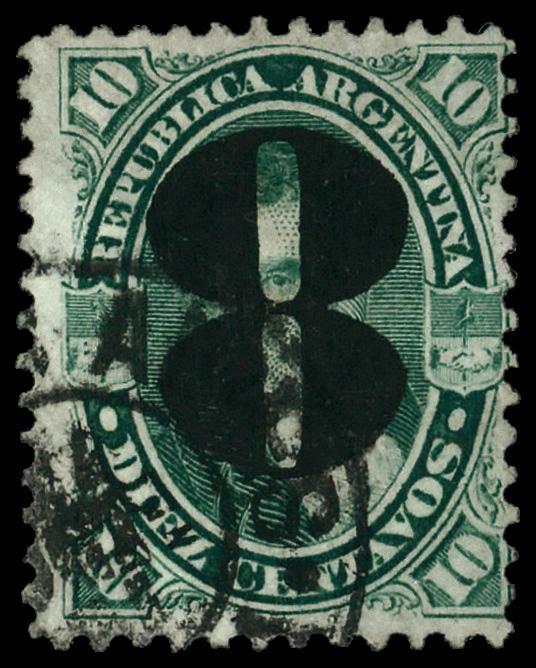 1877, Belgrano, 8c on 10c green, surcharge inverted (Scott 32b), Very Good. Scott $1,000. (Image)