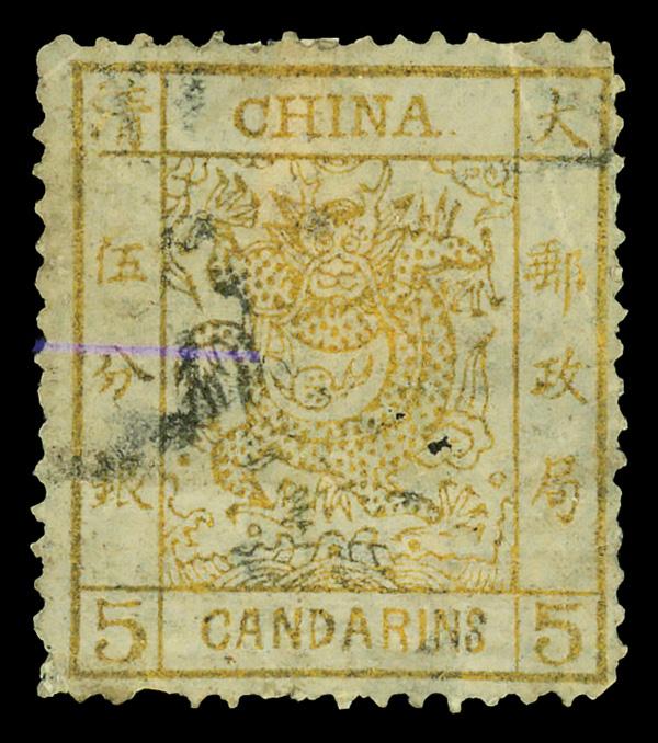 1878, Large Dragon on thin paper, 5ca orange (Scott 3), single, Very Good to Fine, Pin holes, creased, some pulled perfs. Chan 3. Scott $600. (Image)