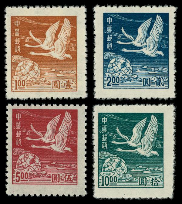 1949, Silver Yuan, Flying Geese, $1-$10 complete (Scott 984-987), without gum as issued, Very Fine. Chan S18-S21. Scott $240. (Image)