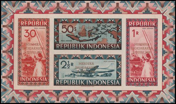 1949, Liberation of Djakarta overprint, Airmail souvenir sheet, imperf (Scott 118a), a choice mint example, o.g., never hinged, Extremely Fine. Scott $250. (Image)