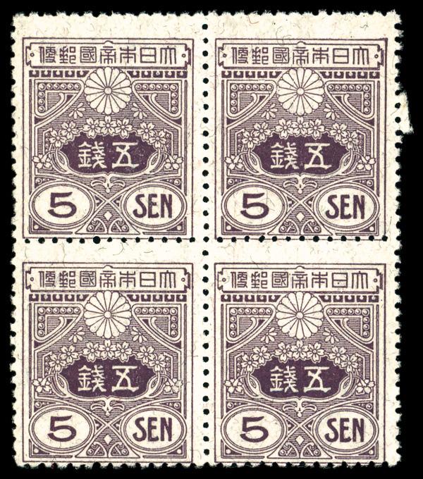 1914, Tazawa, 5s violet (Scott 133), large ("old") die, block of 4, o.g., never hinged, Very Good to Fine. J.S.C.A. 148. Scott $70. (Image)