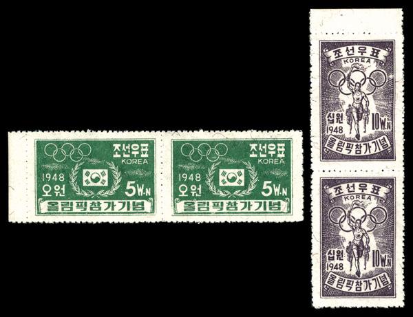 1948, 5w-10w Olympic Games, complete (Scott 85-86), set of 2, pairs, o.g., never hinged, Very Fine to Extremely Fine. Scott $540. (Image)