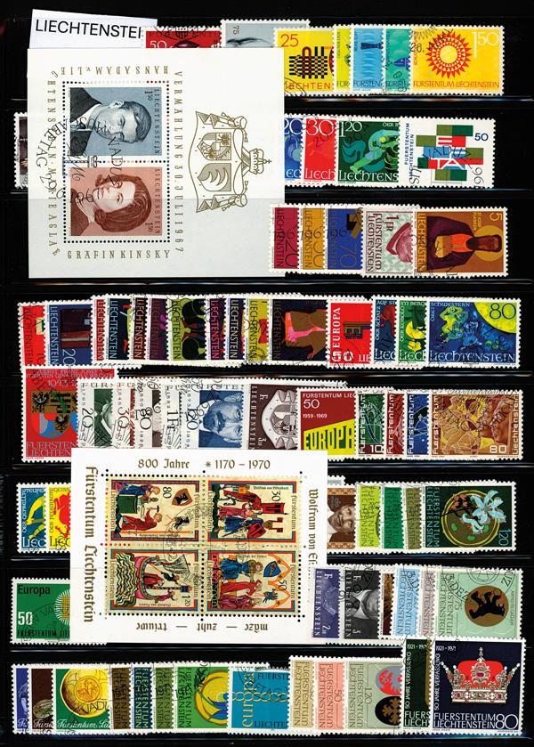 Liechtenstein, More Stamps than People, 1963-99, 800+ used (extremely light cancel to order) singles, sets, and souvenir sheets neatly arranged on black stock pages; items range from #380//1205, and B24; numerous complete sets and arranged in catalog order; catalog $700, Fine to Very Fine. (PDF for this Lot) (Image)