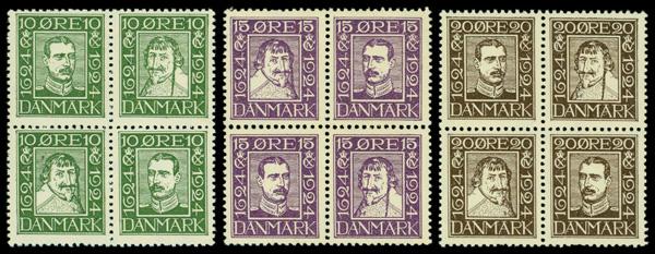 1924, Postal Service Anniversary complete (Scott 167a, 171a, 175a), blocks of 4, o.g., never hinged, Fine to Very Fine. Scott $225. (Image)