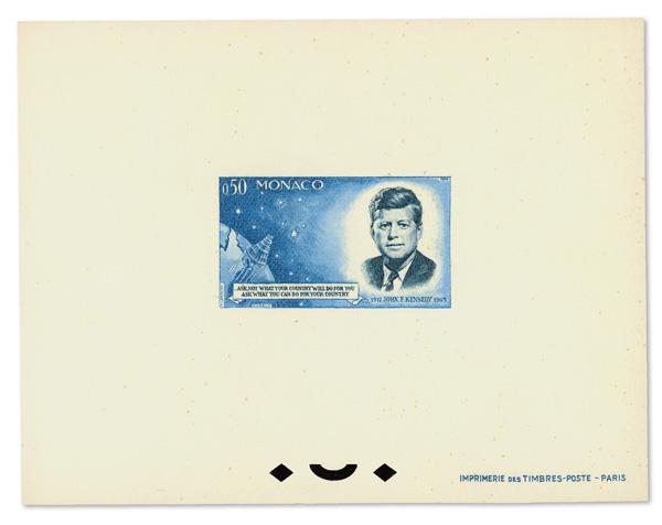 1964, 50c John F. Kennedy, deluxe sheet (Scott 596 var.), ungummed, on carton paper, strong, bright colors; thumbnail wrinkle and small toned spots noted for accuracy, Very Fine, Yvert value for "special block on gummed paper". Yvert 658 var.; €500 ($540). (Image)