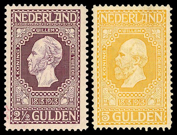 1913, King William II and III, 2½g purple and 5g yellow straw paper (Scott 99-100), singles, o.g., lightly hinged or hinge remnant, Fine to Very Fine. Scott $345. (Image)