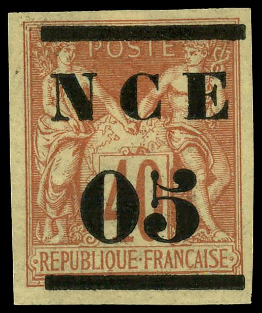 1882, French Colonies 40¢ red on straw over printed NCE 5 (Scott 2), single, o.g., hinged, Fine to Very Fine. Scott $425. (Image)