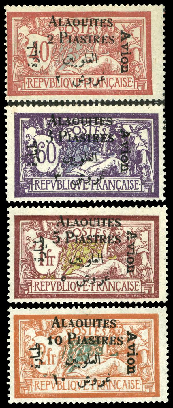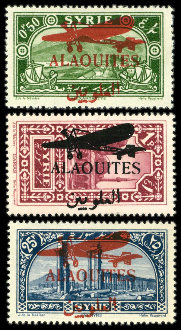 1929, Syria pictorials overprinted complete (Scott C17-C19), complete set of singles, o.g., hinged, Fine to Very Fine. Scott $67. (Image)