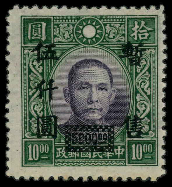1942-45, $10 dark green & dull purple Dr. Sun Yat-sen surcharged (Scott 9N71a), single, o.g., never hinged, Fine to Very Fine. Scott $125. (Image)