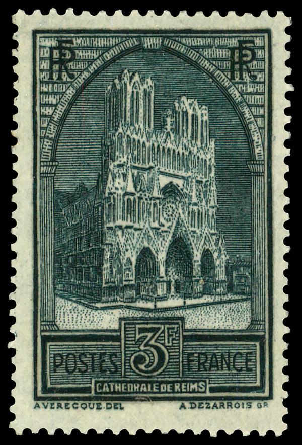 1931, Reims Cathedral, 3fr bluish slate, type IV (Scott 248), single, o.g., hinged, Fine to Very Fine. Yvert 259c. Scott $125. (Image)