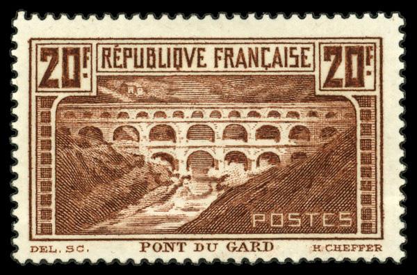 1929, Pont du Gard, 20fr red brown, perf. 13½ (Scott 253), single, o.g., hinged, Fine to Very Fine. Yvert 262A. Scott $275. (Image)