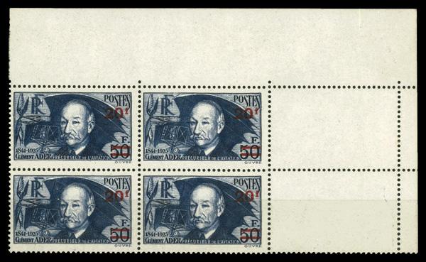 1941, Clément Ader surcharged, 20fr on 50fr dark ultramarine, thick paper (Scott 414), top right corner margin block of 4, o.g., never hinged, Fine to Very Fine. Yvert 493. Scott $70. (Image)