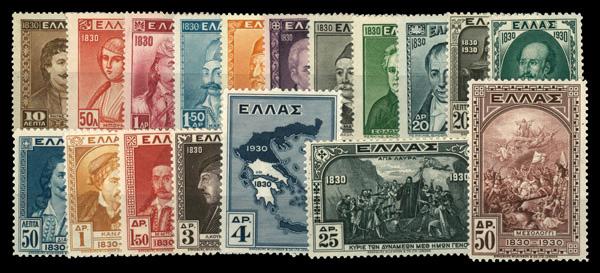 1930, Centenary of Greek Independence complete (Scott 344-361), set of 18, complete set of singles, o.g., never hinged, Fine to Very Fine. Michel 327 A-344 B. Scott $275. (Image)