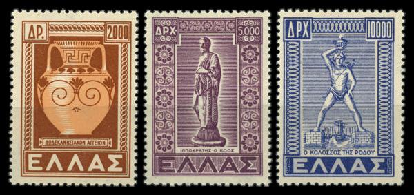 1950, Return of the Dodecanese to Greece complete (Scott 520-522), set of 3, complete set of singles, o.g., never hinged, Fine to Very Fine. Michel 572, 574-575. (Image)