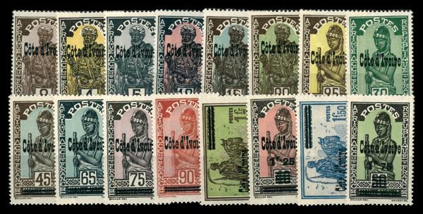 1933, Upper Volta issue overprinted Cóte d'Ivoíre complete (Scott 96-111), complete set of singles, o.g., never hinged, Fine to Very Fine. Scott $59. (Image)