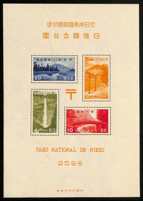 1938, Nikko National Park, souvenir sheet of 4 (Scott 283a), includes the folder with violet Golden Gate International Exposition Japan Pavilion cancel, o.g., never hinged, Very Fine. J.S.C.A. P9. Scott $140. (Image)