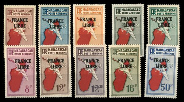 1942, Airplane and Map of Madagascar complete (Scott C27-C36), complete set of singles, o.g., never hinged, Fine to Very Fine. Scott $190. (Image)