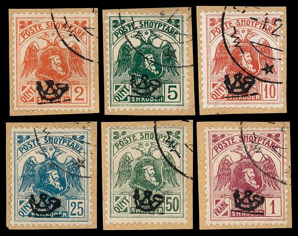 1920, 2q-1fr Skanderbeg & Double Headed Eagle, post horn overprint, complete (Scott 129-134), Fine to Very Fine. Scott $107. (Image)