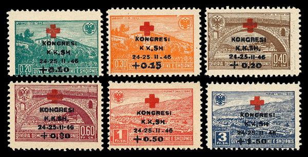 Semi-Postal, 1946, Albanian Red Cross Congress, complete (Scott B28-B33), set of 6, o.g., lightly hinged or hinge remnant, Fine. Scott $66. (Image)