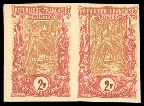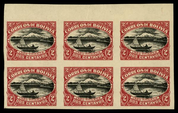 1916, 2c carmine & black Lake Titicaca, imperf. (Scott 113a), top margin block of 6, disturbed o.g., Very Fine to Extremely Fine. Scott $135. (Image)