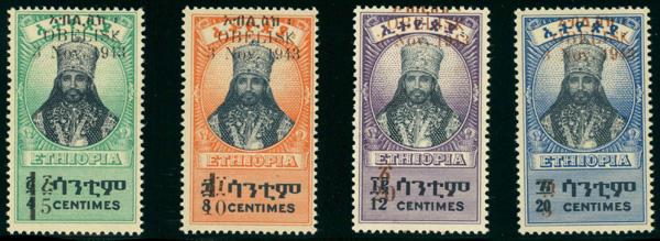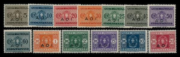 1941, Coat of Arms overprinted A.O.I. complete (Scott J1-J13), complete set of singles, o.g., lightly hinged, Fine to Very Fine. Scott $170. (Image)