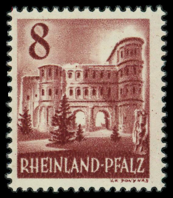 1949, Porta Nigra, Trier 8pf rose brown without "PF" (Scott 6N33A), single, o.g., never hinged, Fine to Very Fine. Scott $65. (Image)