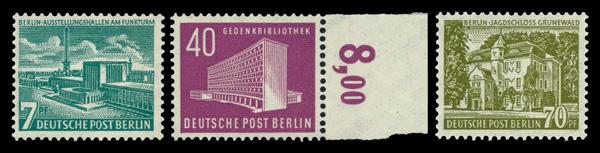 1954 Buildings complete (Scott 9N108-9N110), complete set of margin singles, o.g., never hinged, Fine to Very Fine. Michel 121-123. Scott $100. (Image)