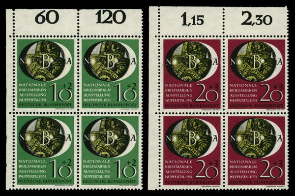 1951 Wuppertal complete (Scott B318-B319), corner margin blocks of 4, o.g., never hinged, Very Fine to Extremely Fine. Michel 141-142. Scott $270. (Image)