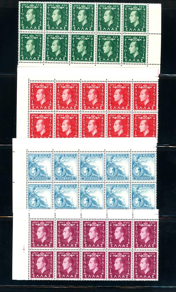 1952, 200d-10,000d King's Birthday, complete (Scott 545-548), set of 4, corner margin blocks of 10, o.g., never hinged, Extremely Fine. Scott $880. (Image)