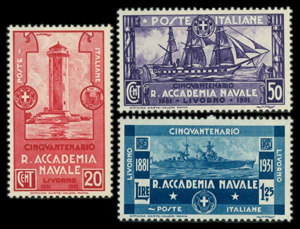 1931, 5oth anniversary of the Royal Naval Academy at Leghorn (Livorno) complete (Scott 265-267), complete set of singles, o.g., never hinged, Fine to Very Fine. Scott $165. (Image)