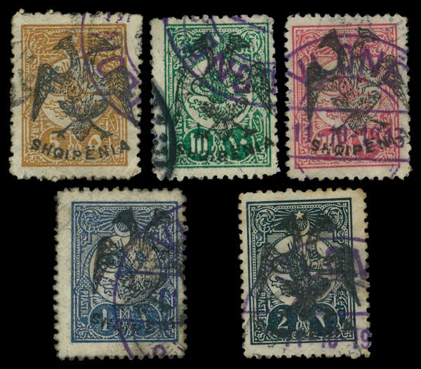 1913, 5pa-2pi Turkey, 'SHQIPENIA' & eagle overprint (Scott 4-8), Fine to Very Fine. Scott $1,625. (Image)