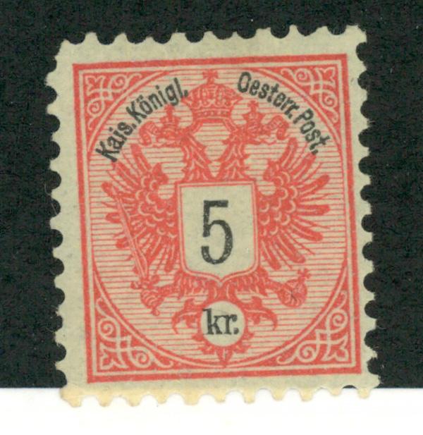 1883, Double Eagle, 5kr rose & black (Scott 43), single, o.g., invisibly hinged, Fine to Very Fine, short top left perforation. Michel 46. Scott $75. (Image)