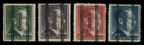 1945, Graz overprints (narrow "Österreich") on 1RM to 5RM complete (Scott 428-431), set of 4, complete set of singles, o.g., never hinged, Fine to Very Fine. Michel 693 II-696 II. Scott $400. (Image)
