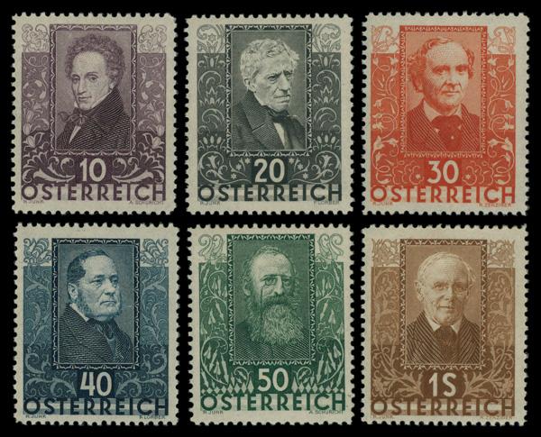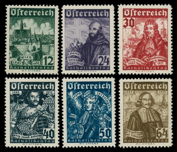 1933, Catholic Congress and Deliverance of Vienna from the Turks complete (Scott B112-B117), set of 6, o.g., lightly hinged or hinge remnant; 64g surface tear, Extremely Fine. Michel 557-562. Scott $115. (Image)