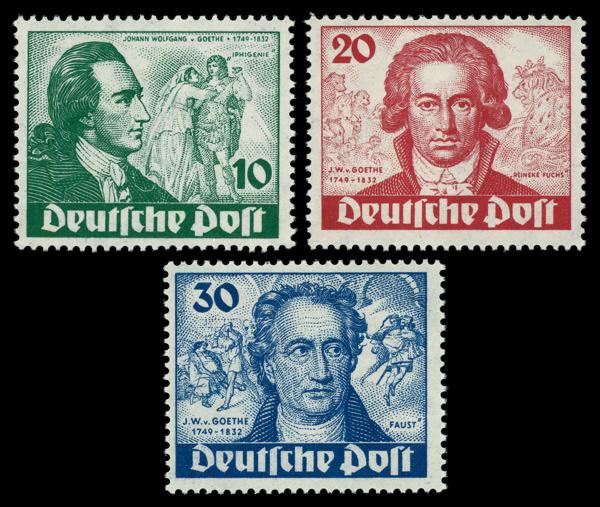 1949 Goethe complete (Scott 9N61-9N63), o.g., never hinged, Very Fine. Michel 61-63. Scott $240. (Image)