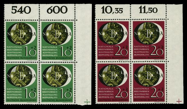 1951 Wuppertal complete (Scott B318-B319), corner margin blocks of 4, o.g., never hinged, Very Fine to Extremely Fine. Michel 141-142. Scott $270. (Image)