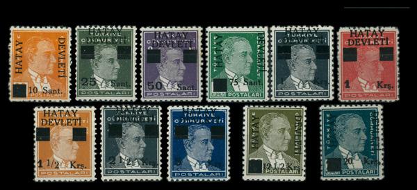 1939, Mustafa Kemal Pasha (Kemal Atatürk) surcharged complete (Scott 1-11), complete set of singles, o.g., hinged, Fine to Very Fine. Scott $57. (Image)