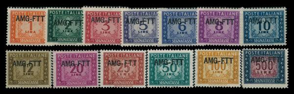 1949-54, 1l-500l Numerals complete overprinted (Scott J16-J29), complete set of singles, o.g., never hinged, Fine to Very Fine. Scott $151. (Image)