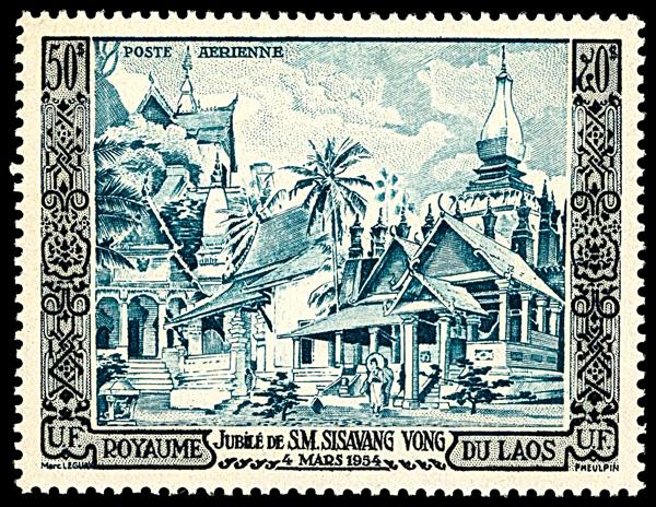 1954, Composite of Laotian Temples complete (Scott 25-26,C13), complete set of singles, o.g., never hinged, Fine to Very Fine. Scott $175. (Image)
