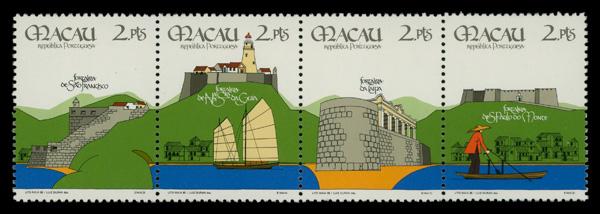 1986, Fortresses complete (Scott 537a), se-tenant strip of 4, o.g., never hinged, Fine to Very Fine. Scott $80. (Image)
