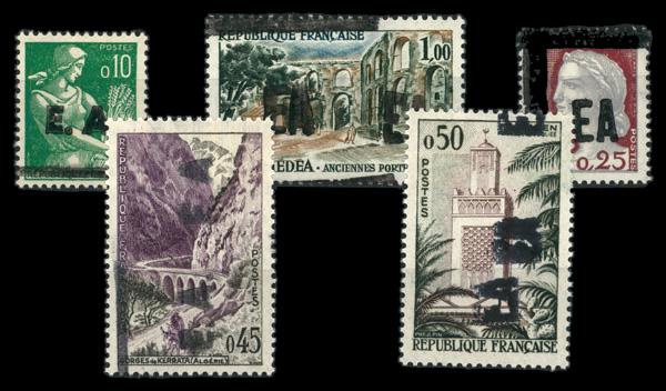1962, First issue of Independent State of Algeria, France 939, 945-946, 968 & 1013 overprinted by handstamped complete (Scott 286a-290a), complete set of singles, o.g., never hinged, Fine to Very Fine. Scott $69. (Image)