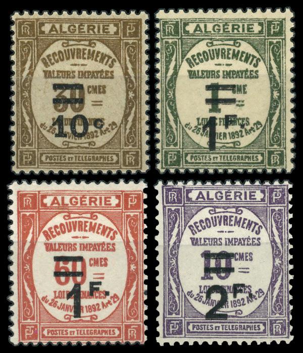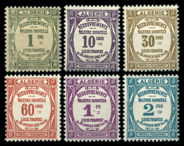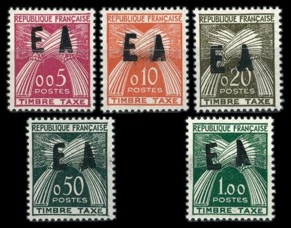 1962, First issue of Independent State of Algeria, France J93 - J97 overprinted by Typographed complete (Scott J49a-J53a), complete set of singles, o.g., never hinged, Fine to Very Fine. Scott $189. (Image)