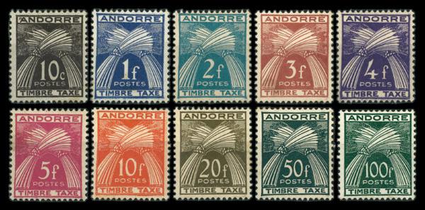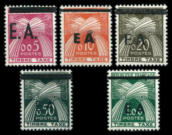 Postage Dues, 1946, 10c-100f "Timbre-Taxe" complete (Scott J32-J41), complete set of singles, o.g., never hinged, Fine to Very Fine. Maury 32-41. (Image)